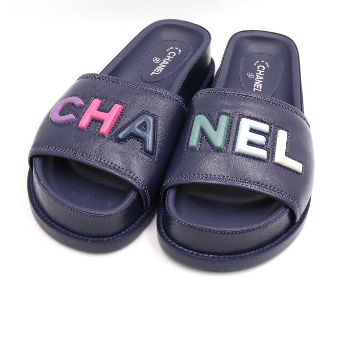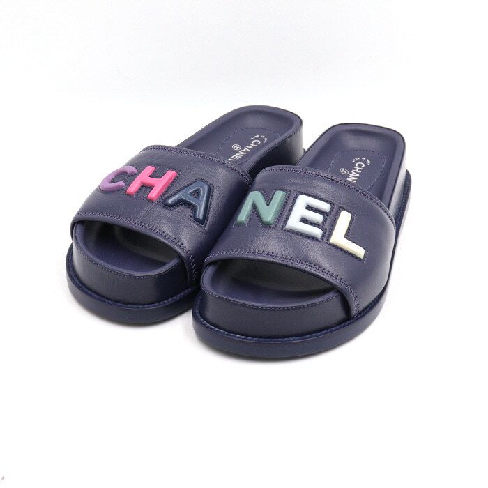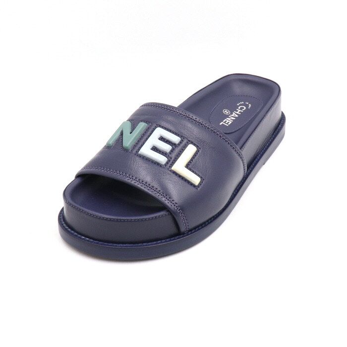 CHANEL Lettering Logo Navy Leather Women's Sandal Slippers G38933