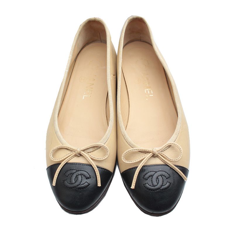 – Classic two-tone flat shoes with black captoe and beige upper transcend trends and embody femininity and chicness