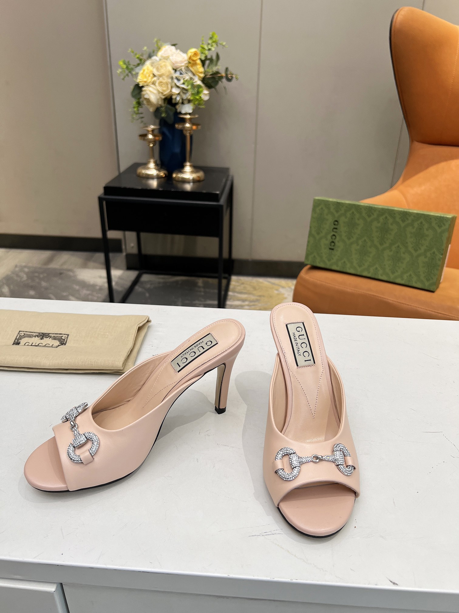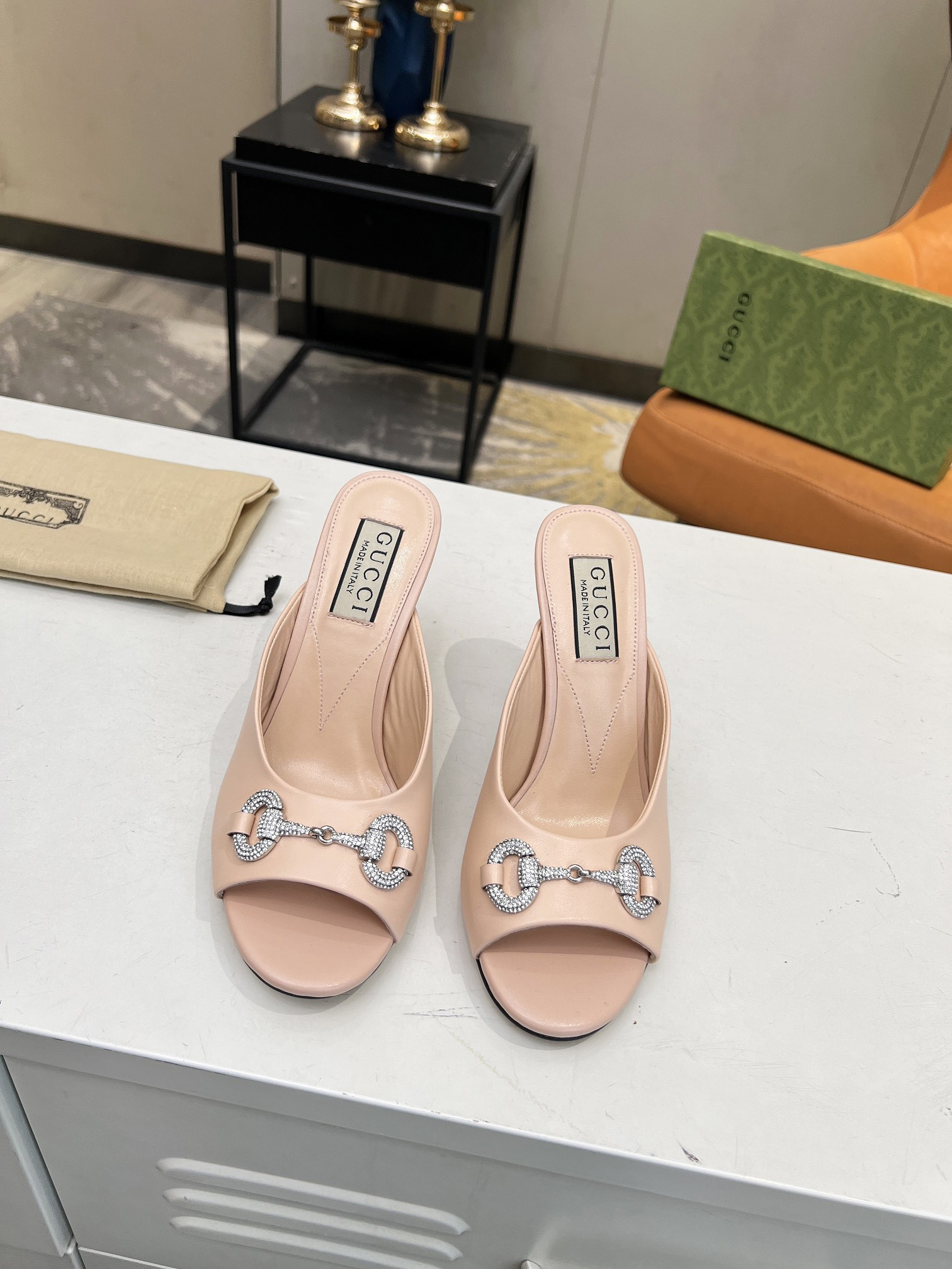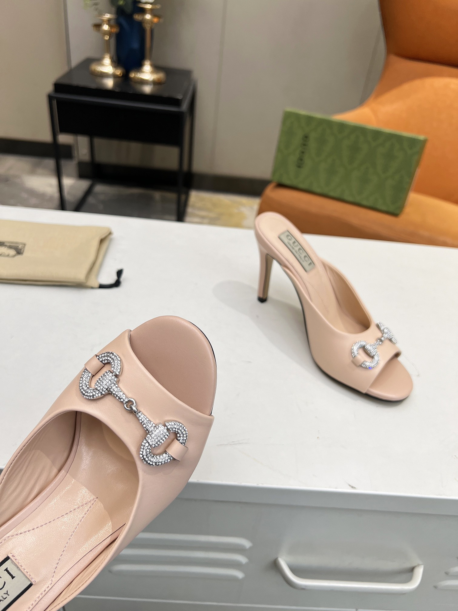 Gucci continues to make an appearance throughout every collection through immediately recognizable logo details. Here, this pair of calfskin leather slide sandals is defined by the Horsebit hardware with crystals.