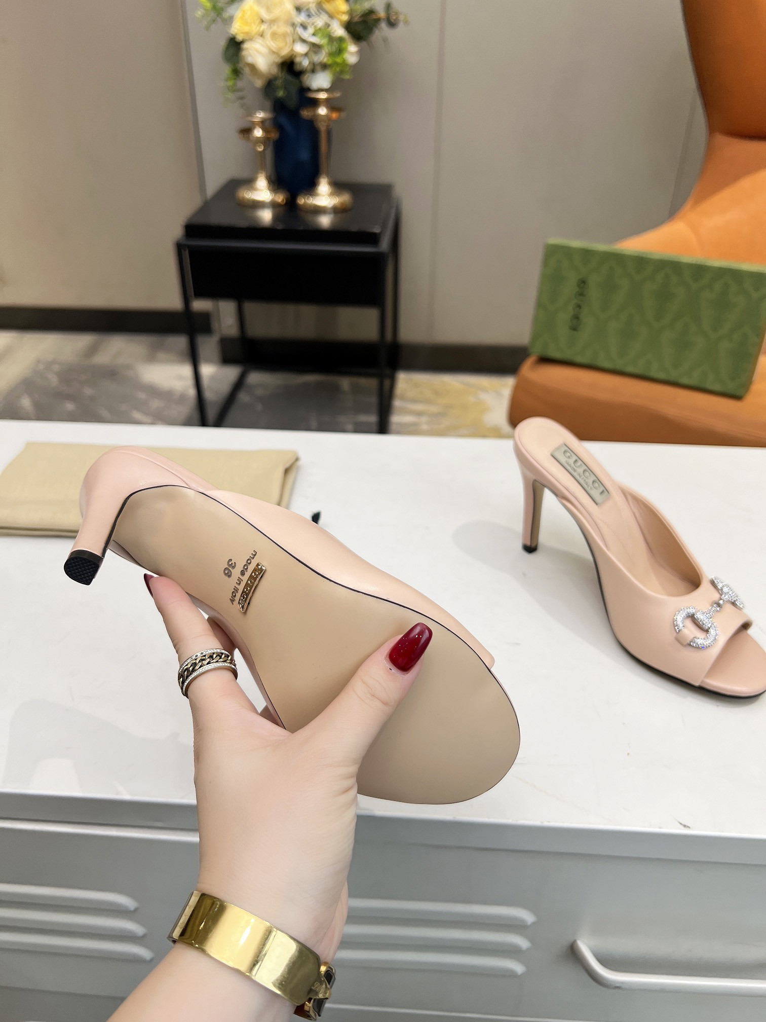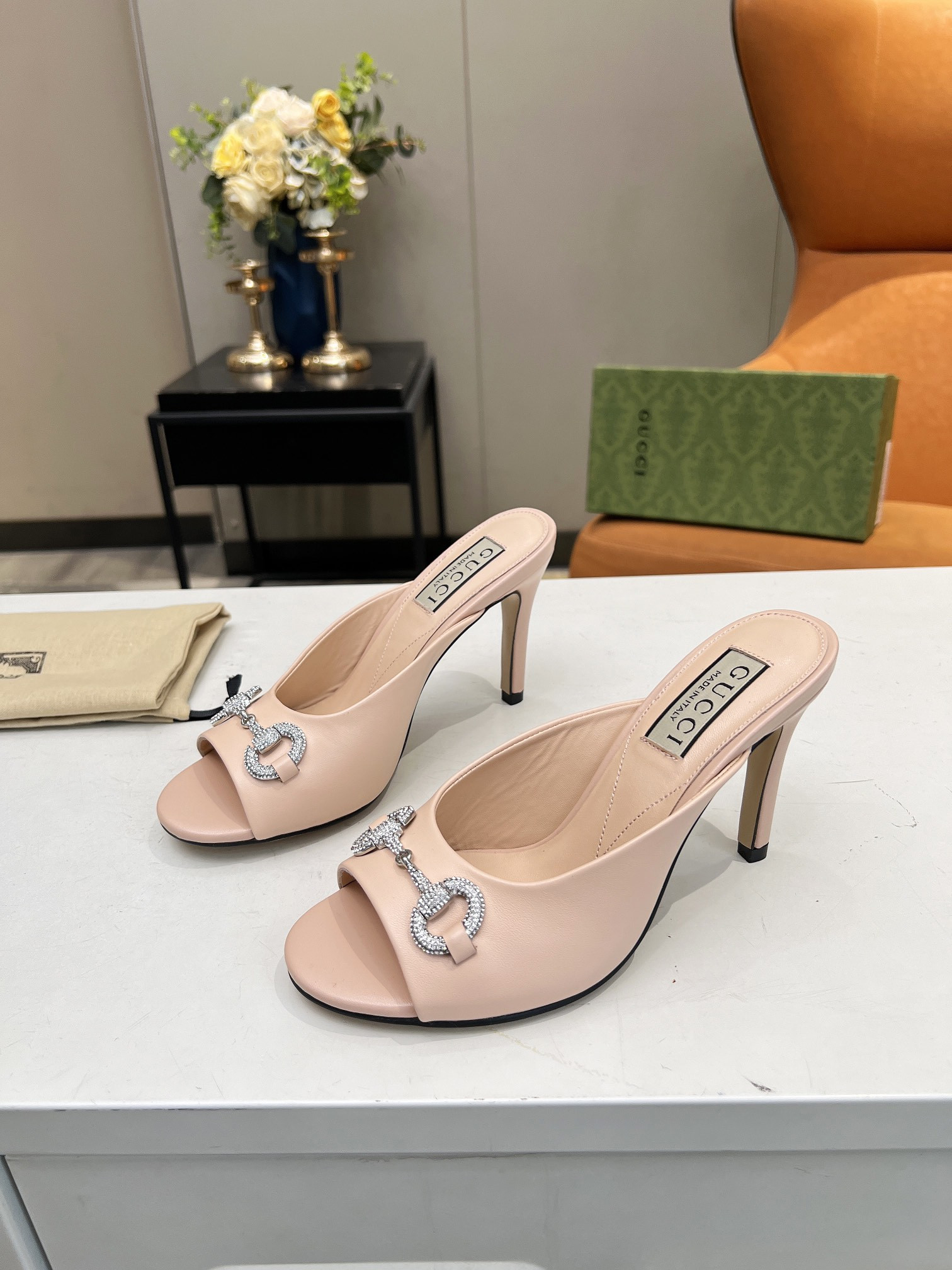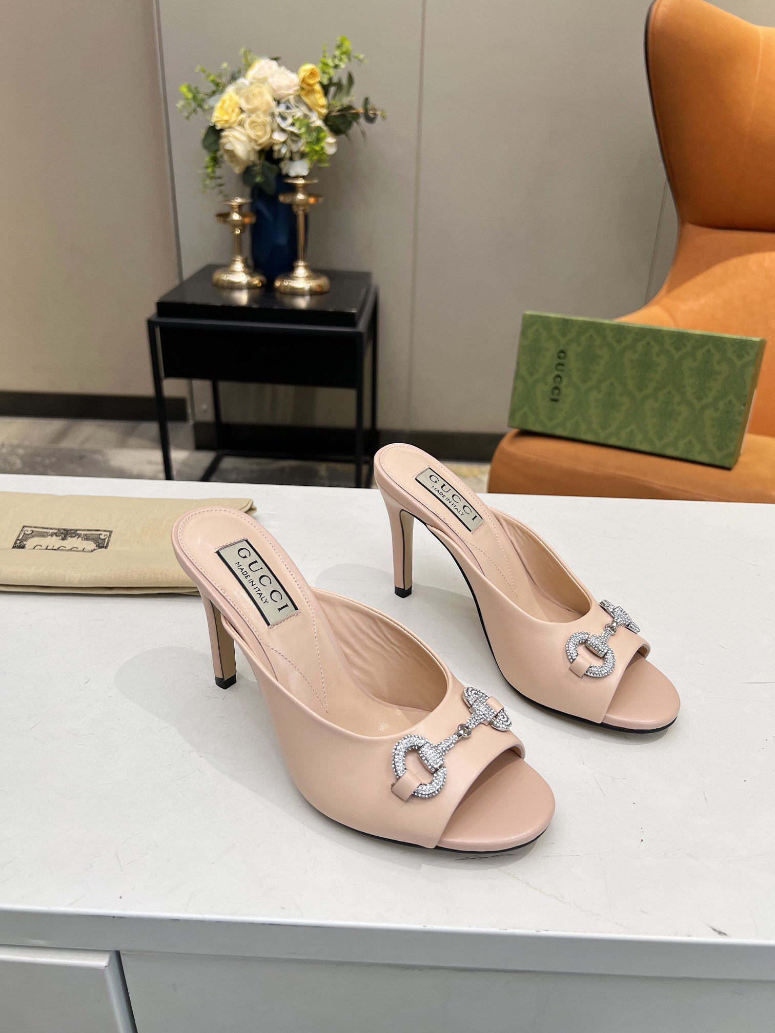 Gucci continues to make an appearance throughout every collection through immediately recognizable logo details. Here, this pair of calfskin leather slide sandals is defined by the Horsebit hardware with crystals.